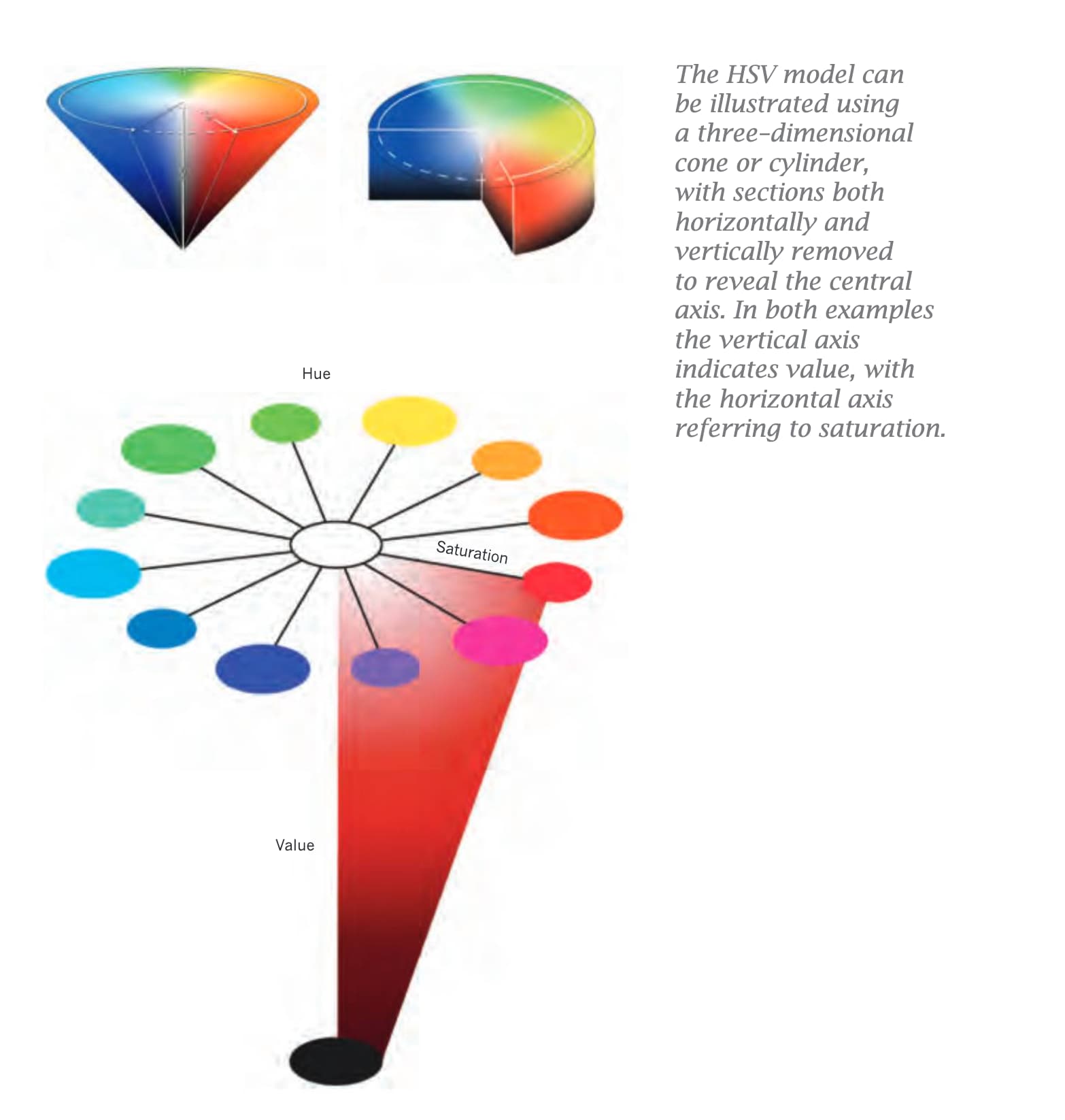 The HSV model can be illustrated using a three-dimensional cone or cylinder, with sections both horizontally and vertically removed to reveal the central axis.